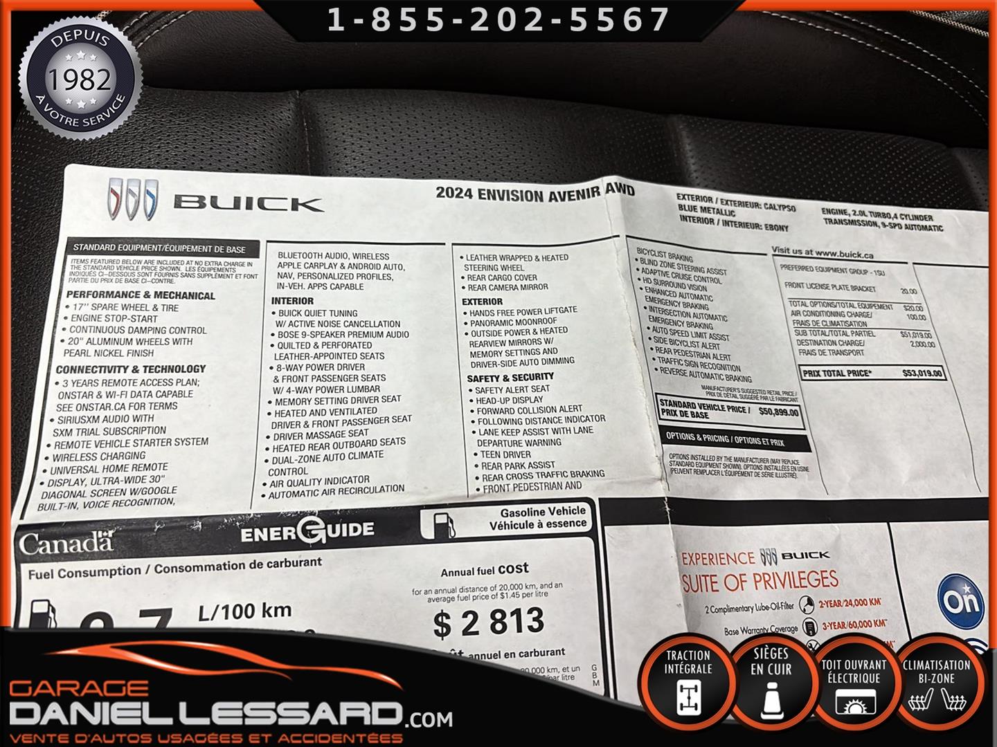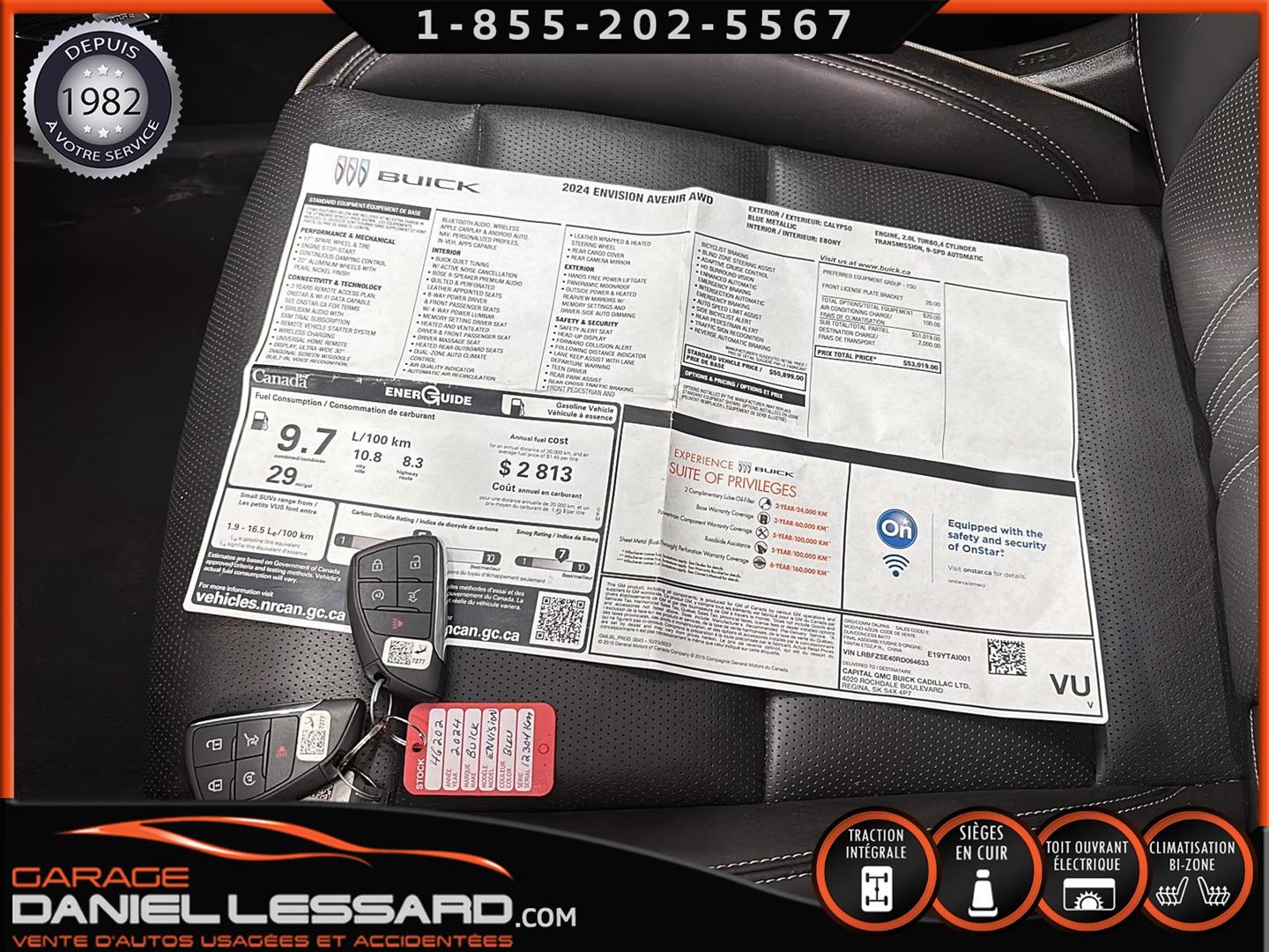 2024 BUICK ENVISION FUTURE AWD, CALYPSO METALLIC BEAUTIFUL, 2.0L TURBO ENGINE, 9-SPEED TRANSMISSION, LEATHER INTERIOR, STEERING WHEEL AUDIO, PHONE AND CRUISE CONTROLS, POWER AND VENTILATED FRONT SEATS, PANORAMIC SUNROOF, MANUAL TAILGATE, ALLOY WHEELS WITH 245/45/20 CONTINENTAL SUMMER TIRES WITH 20% WEAR, TINTED WINDOWS, 3 GARAGE DOOR OPENERS, BOSE SOUND SYSTEM REARVIEW CAMERA AND PROXIMITY SENSORS, SIRIUS, NAVIGATION, BLIND SPOT MONITORING, 2 KEYS WITH REMOTE START AND COMPANY API