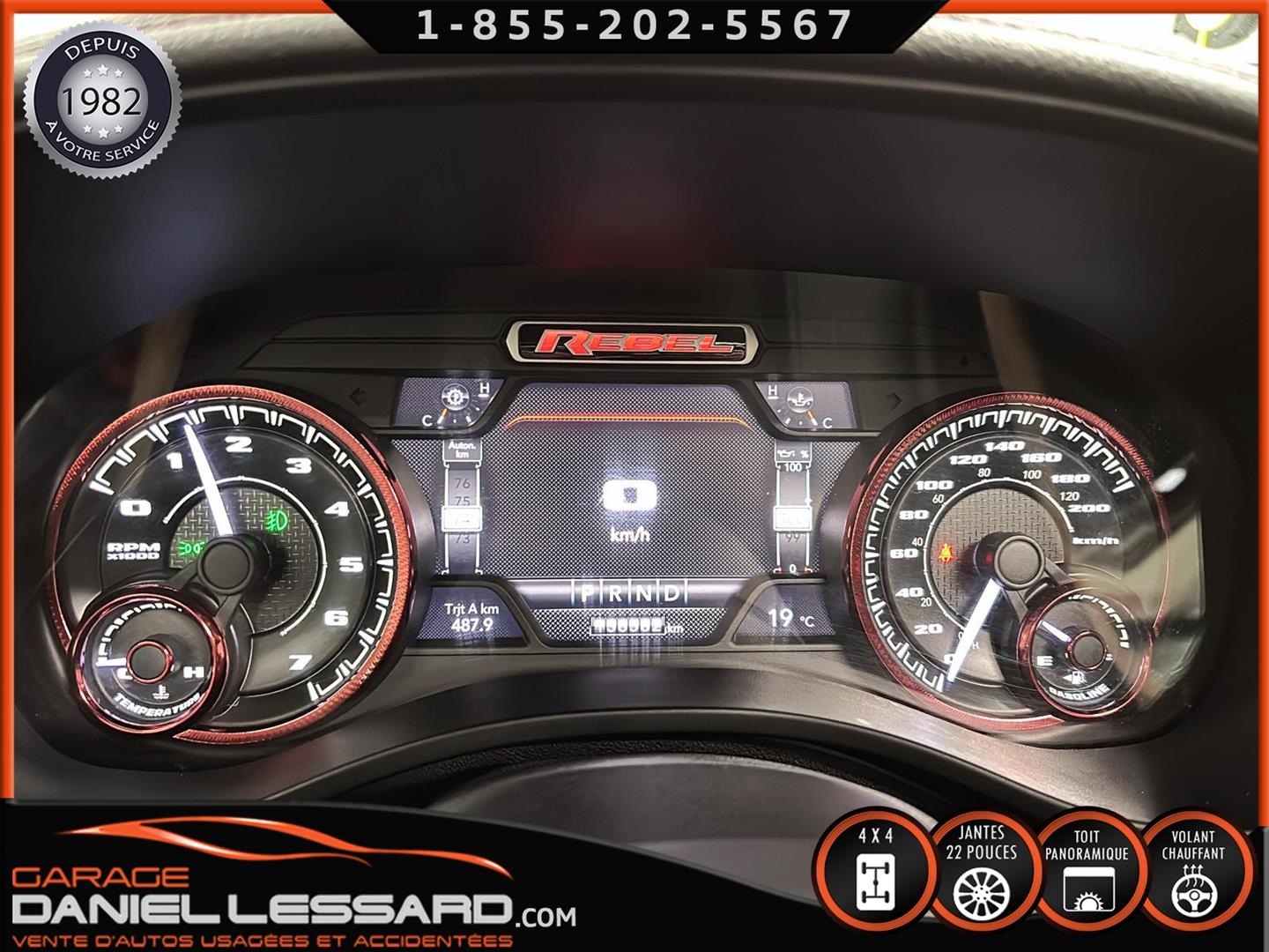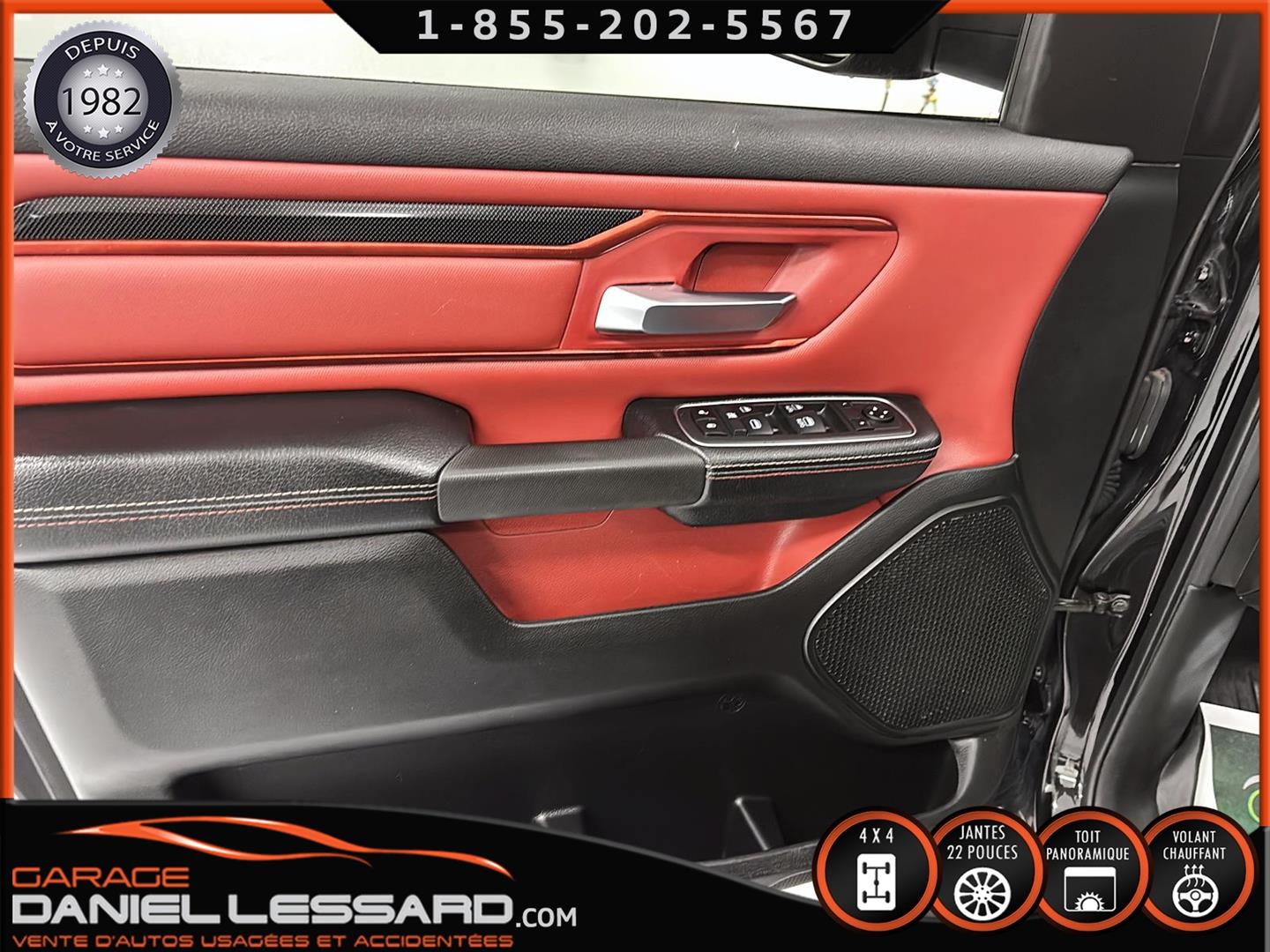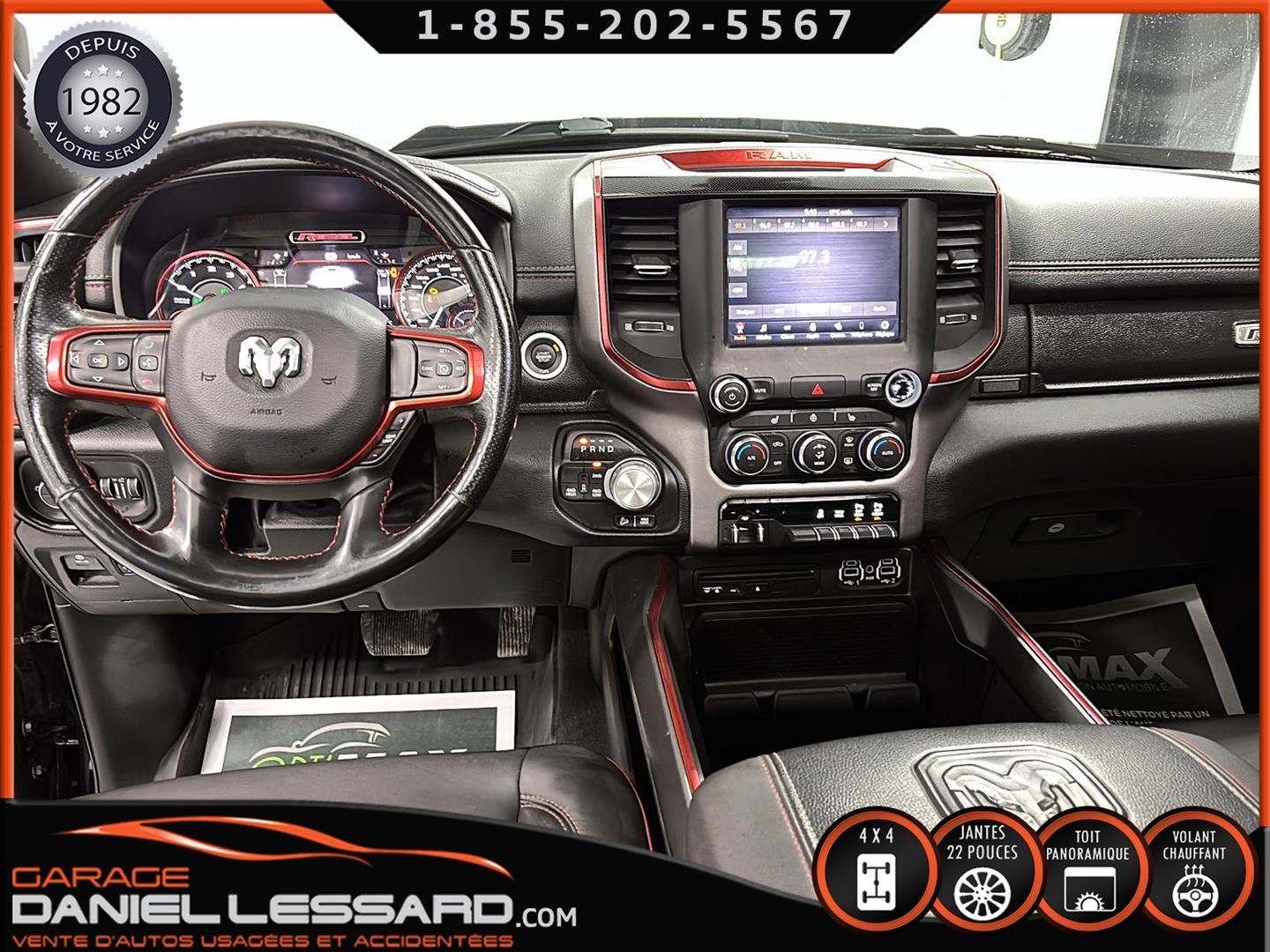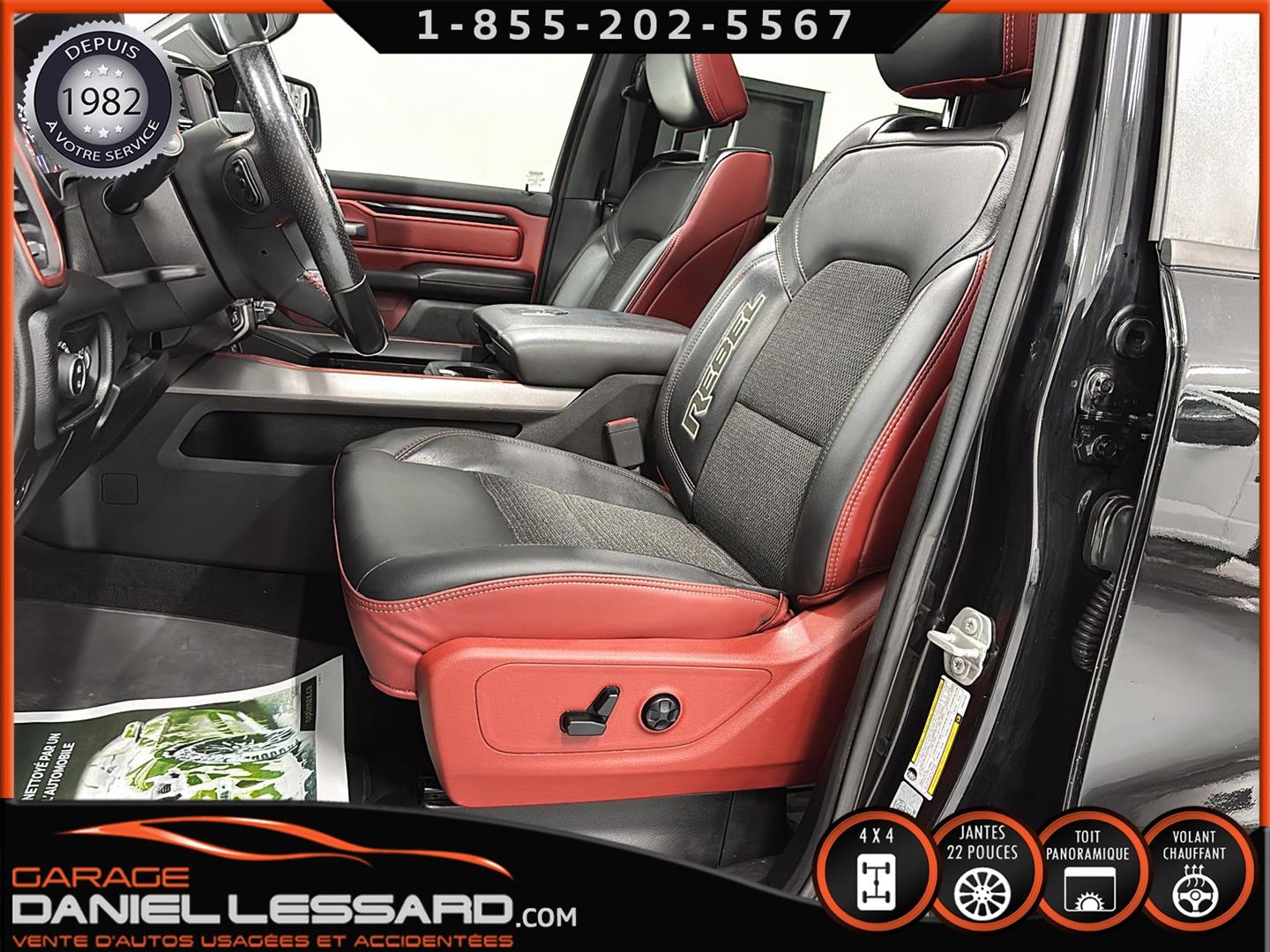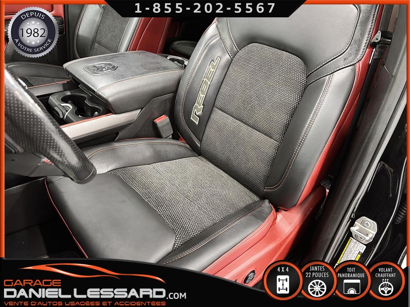 2019 RAM 1500 **REBEL** WITH 136 HP. 562 KM ON THE ODOMETER, CREWCAB WITH 4 FULL DOORS AND 5.7-FOOT BOX, BOX COVER INCLUDED, 5.7-LITER HEMI V-8 ENGINE, TWO-TONE BLACK AND RED LEATHER AND SUEDE INTERIOR, HEATED FRONT SEATS, HEATED STEERING WHEEL, LARGE PANORAMIC SUNROOF, PREMIUM ALPINE SOUND SYSTEM, 8.4-INCH TOUCHSCREEN DISPLAY, REARVIEW CAMERA WITH FRONT AND REAR PARKING SENSORS, DUAL-ZONE CLIMATE CONTROL, BLIND SPOT MONITORING, HIGH-INTENSITY HEADLIGHTS, FULL POWER GROUP FOR THE DRIVER, ORIGINAL TOW HITCH WITH 4-PIN WIRING INLET AND 7-STRAND BRAKES, FACTORY-INSTALLED ELECTRIC BRAKE CONTROL MOUNTED ON THE DASHBOARD, FITTED WITH 22-INCH ALLOY WHEELS AND ROYAL BLACK SPIDER R/T ALL-SEASON TIRES (35 X 12.50 R 22 LT), EXTERIOR RUNNING BOARDS, READY TO DRIVE, FACTORY-INSTALLED REMOTE STARTER, AND MUCH MORE! A VERY NICE TRUCK AVAILABLE NOW, UP-TO-DATE MAINTENANCE, 1-MONTH/1700 KM WARRANTY INCLUDED. FINANCING AVAILABLE, CONTACT US FOR MORE INFORMATION OR TO SCHEDULE AN APPOINTMENT!