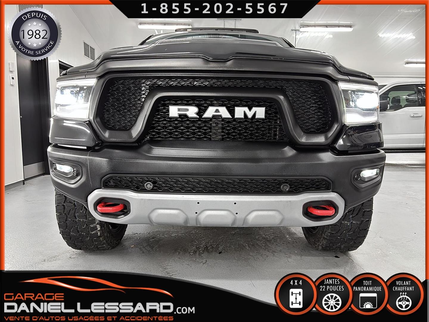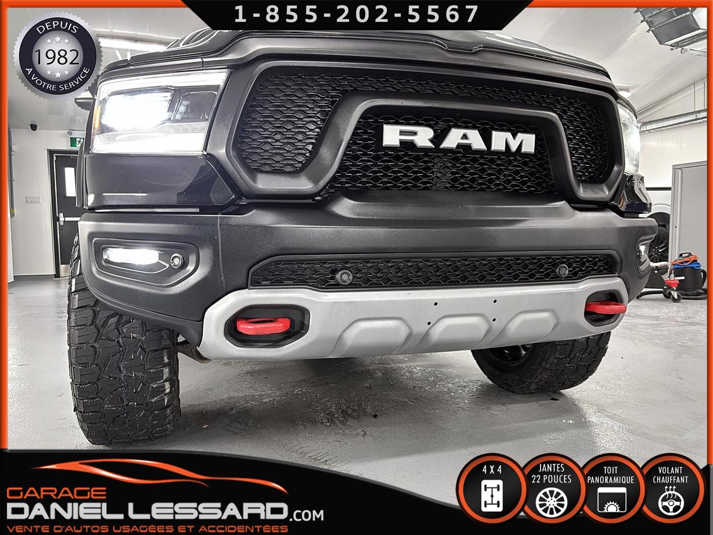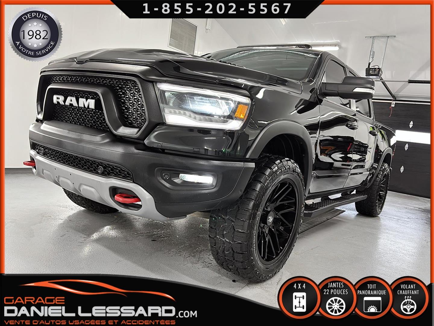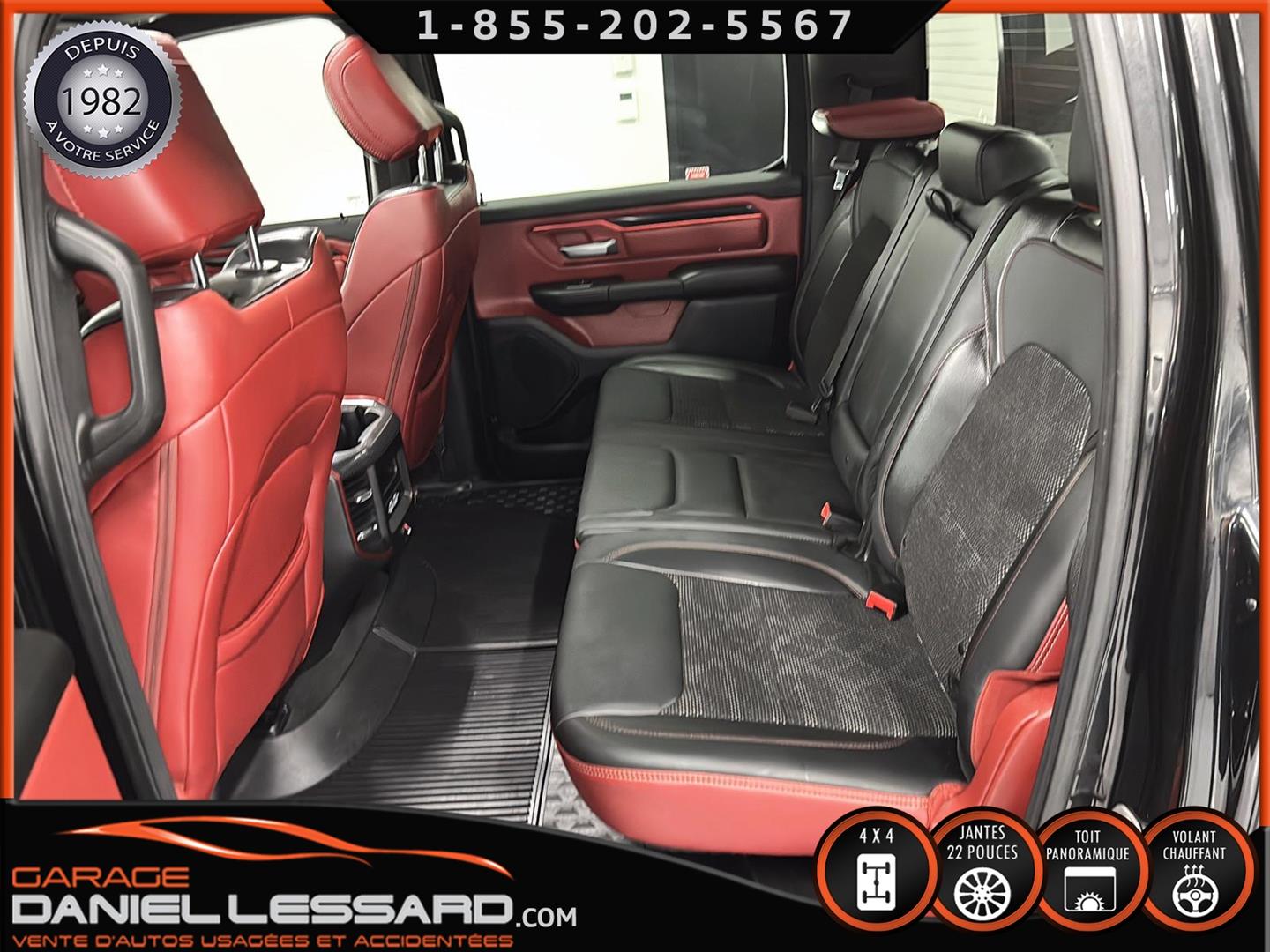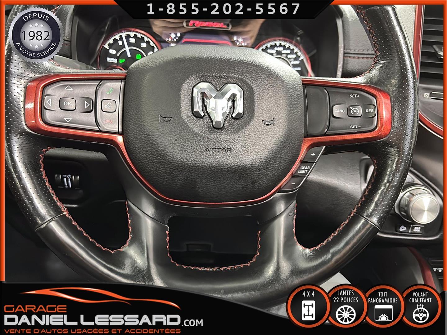 2019 RAM 1500 **REBEL** WITH 136 HP. 562 KM ON THE ODOMETER, CREWCAB WITH 4 FULL DOORS AND 5.7-FOOT BOX, BOX COVER INCLUDED, 5.7-LITER HEMI V-8 ENGINE, TWO-TONE BLACK AND RED LEATHER AND SUEDE INTERIOR, HEATED FRONT SEATS, HEATED STEERING WHEEL, LARGE PANORAMIC SUNROOF, PREMIUM ALPINE SOUND SYSTEM, 8.4-INCH TOUCHSCREEN DISPLAY, REARVIEW CAMERA WITH FRONT AND REAR PARKING SENSORS, DUAL-ZONE CLIMATE CONTROL, BLIND SPOT MONITORING, HIGH-INTENSITY HEADLIGHTS, FULL POWER GROUP FOR THE DRIVER, ORIGINAL TOW HITCH WITH 4-PIN WIRING INLET AND 7-STRAND BRAKES, FACTORY-INSTALLED ELECTRIC BRAKE CONTROL MOUNTED ON THE DASHBOARD, FITTED WITH 22-INCH ALLOY WHEELS AND ROYAL BLACK SPIDER R/T ALL-SEASON TIRES (35 X 12.50 R 22 LT), EXTERIOR RUNNING BOARDS, READY TO DRIVE, FACTORY-INSTALLED REMOTE STARTER, AND MUCH MORE! A VERY NICE TRUCK AVAILABLE NOW, UP-TO-DATE MAINTENANCE, 1-MONTH/1700 KM WARRANTY INCLUDED. FINANCING AVAILABLE, CONTACT US FOR MORE INFORMATION OR TO SCHEDULE AN APPOINTMENT!