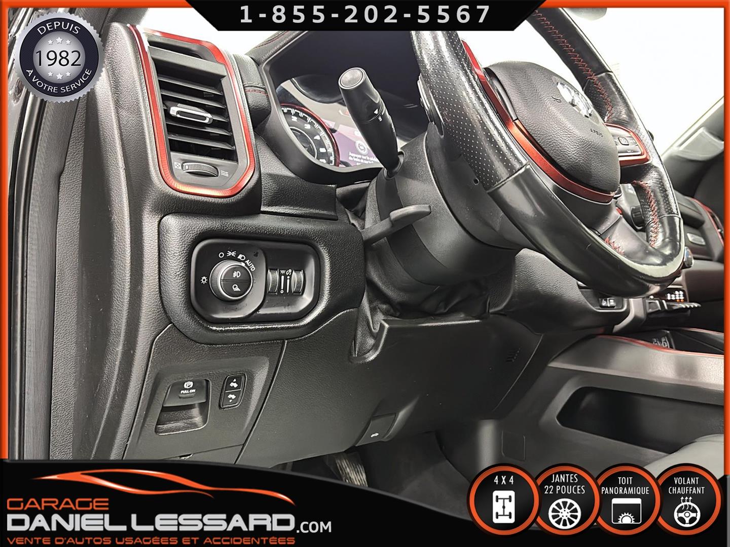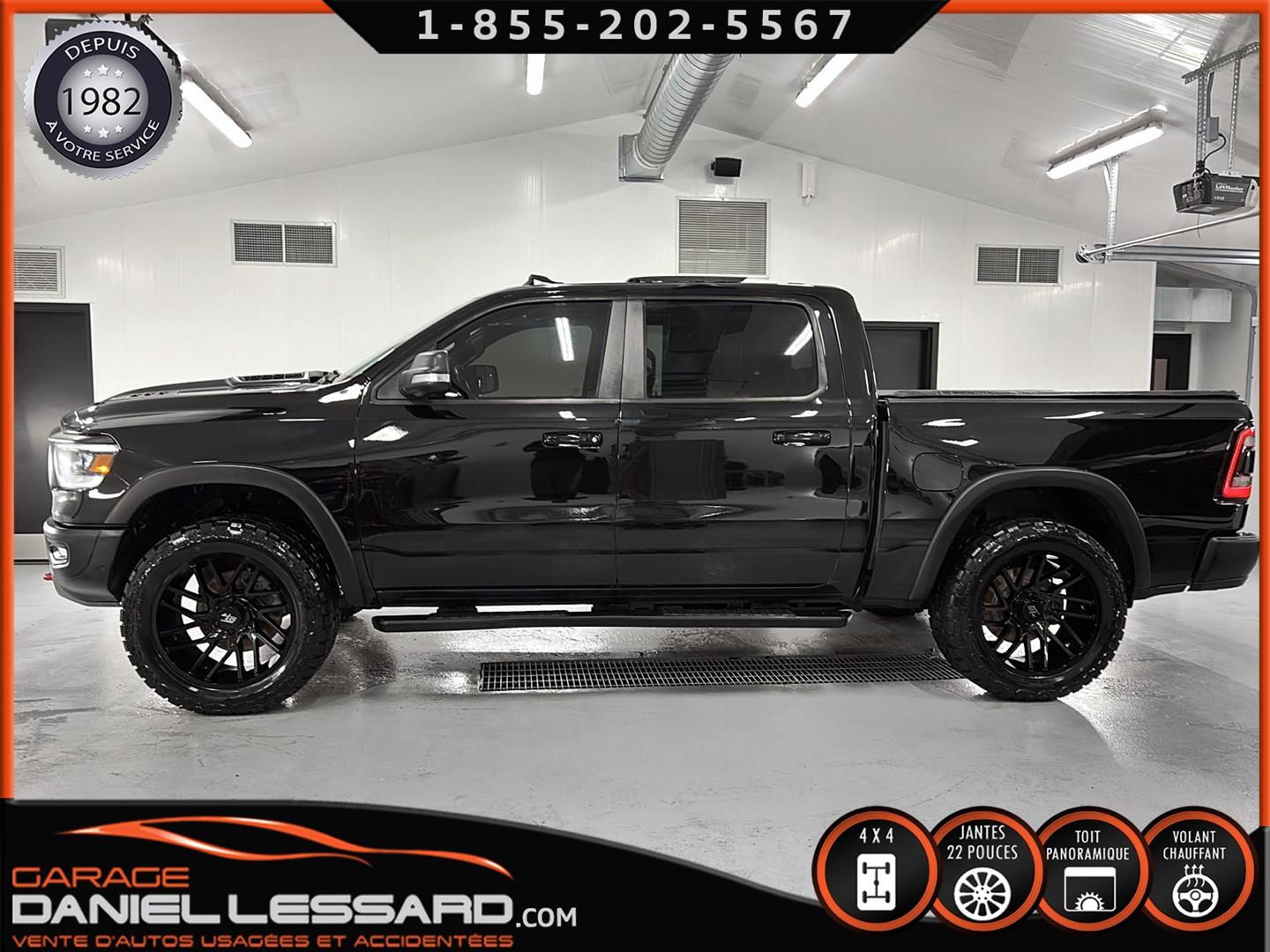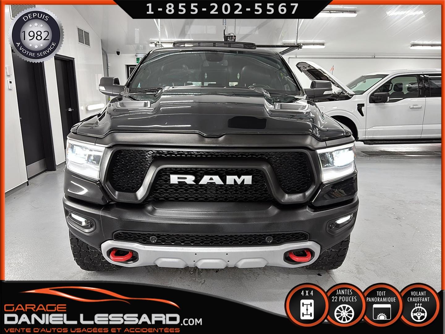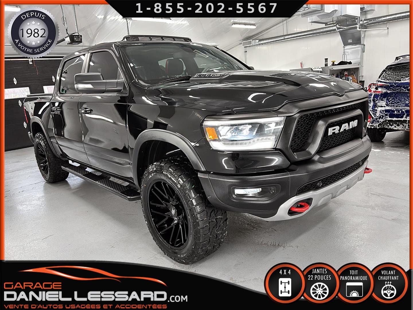 2019 RAM 1500 **REBEL** WITH 136 HP. 562 KM ON THE ODOMETER, CREWCAB WITH 4 FULL DOORS AND 5.7-FOOT BOX, BOX COVER INCLUDED, 5.7-LITER HEMI V-8 ENGINE, TWO-TONE BLACK AND RED LEATHER AND SUEDE INTERIOR, HEATED FRONT SEATS, HEATED STEERING WHEEL, LARGE PANORAMIC SUNROOF, PREMIUM ALPINE SOUND SYSTEM, 8.4-INCH TOUCHSCREEN DISPLAY, REARVIEW CAMERA WITH FRONT AND REAR PARKING SENSORS, DUAL-ZONE CLIMATE CONTROL, BLIND SPOT MONITORING, HIGH-INTENSITY HEADLIGHTS, FULL POWER GROUP FOR THE DRIVER, ORIGINAL TOW HITCH WITH 4-PIN WIRING INLET AND 7-STRAND BRAKES, FACTORY-INSTALLED ELECTRIC BRAKE CONTROL MOUNTED ON THE DASHBOARD, FITTED WITH 22-INCH ALLOY WHEELS AND ROYAL BLACK SPIDER R/T ALL-SEASON TIRES (35 X 12.50 R 22 LT), EXTERIOR RUNNING BOARDS, READY TO DRIVE, FACTORY-INSTALLED REMOTE STARTER, AND MUCH MORE! A VERY NICE TRUCK AVAILABLE NOW, UP-TO-DATE MAINTENANCE, 1-MONTH/1700 KM WARRANTY INCLUDED. FINANCING AVAILABLE, CONTACT US FOR MORE INFORMATION OR TO SCHEDULE AN APPOINTMENT!
