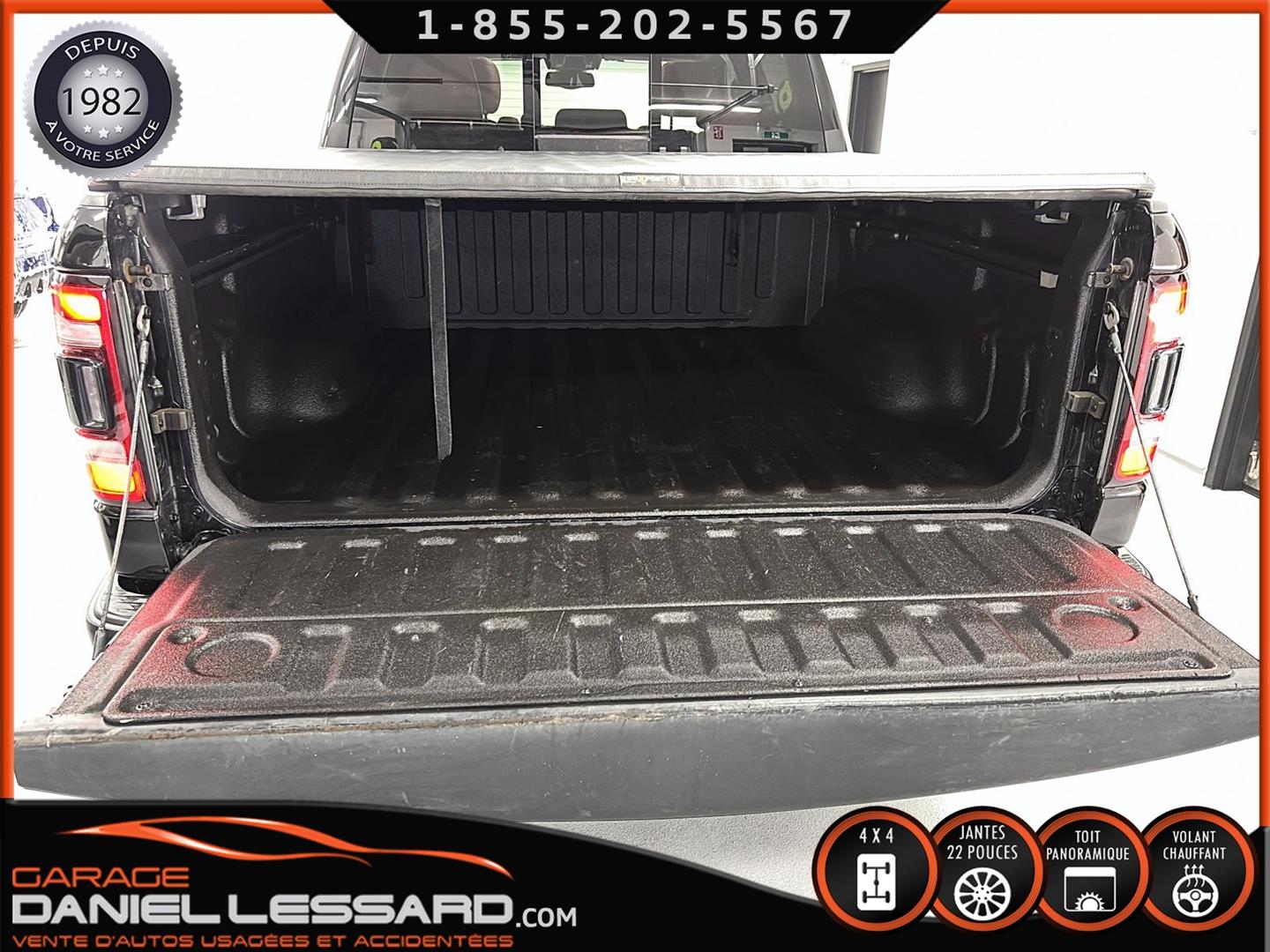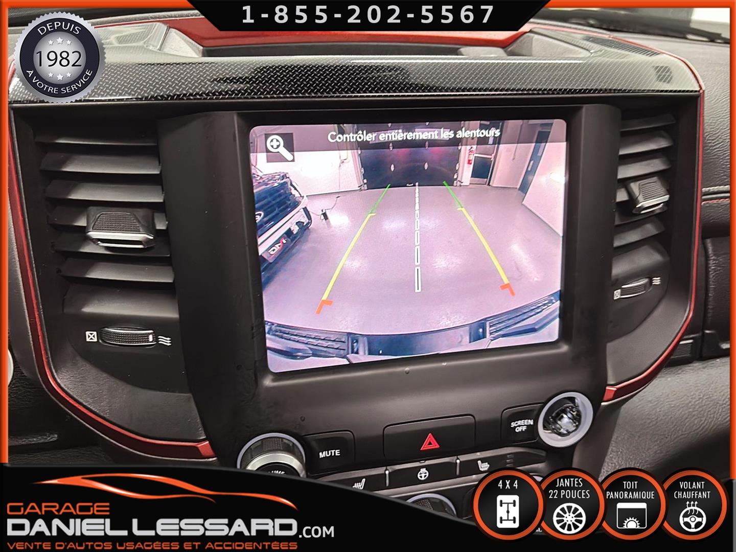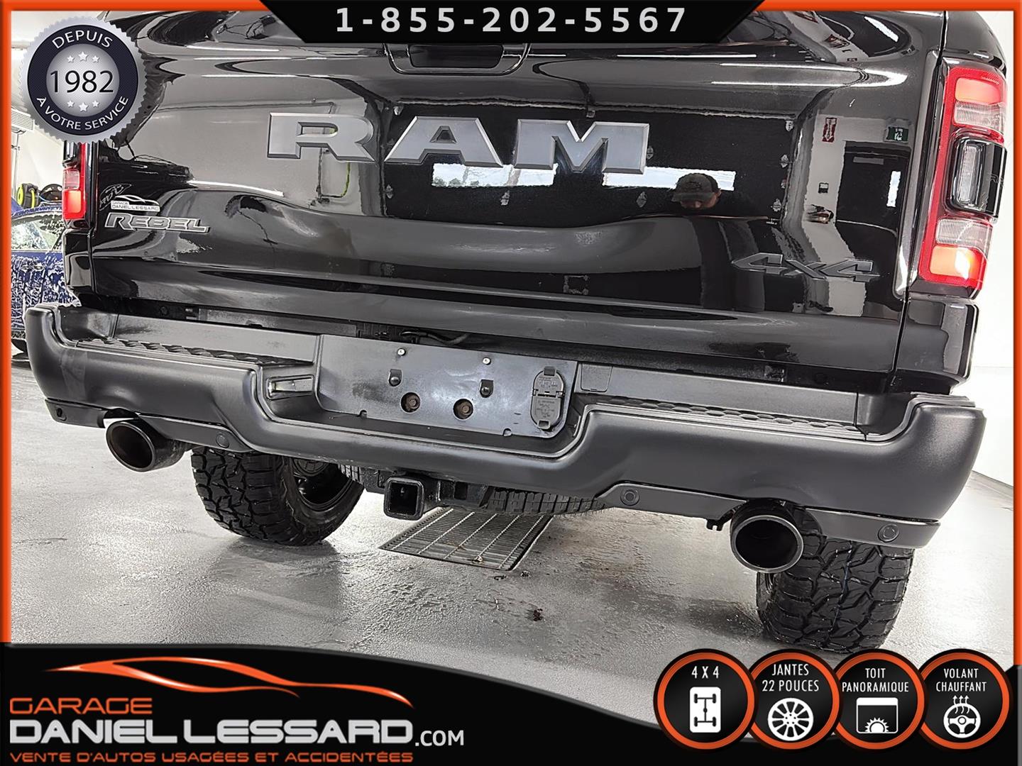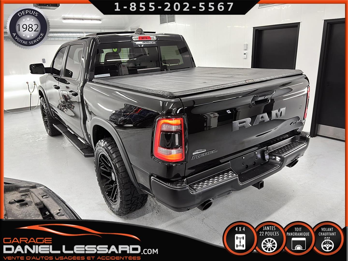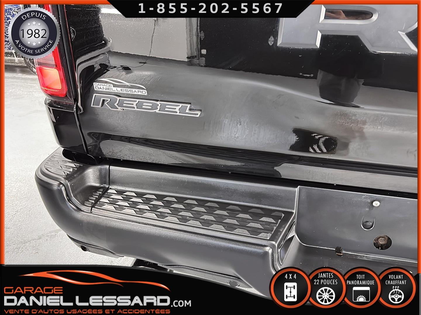 2019 RAM 1500 **REBEL** WITH 136 HP. 562 KM ON THE ODOMETER, CREWCAB WITH 4 FULL DOORS AND 5.7-FOOT BOX, BOX COVER INCLUDED, 5.7-LITER HEMI V-8 ENGINE, TWO-TONE BLACK AND RED LEATHER AND SUEDE INTERIOR, HEATED FRONT SEATS, HEATED STEERING WHEEL, LARGE PANORAMIC SUNROOF, PREMIUM ALPINE SOUND SYSTEM, 8.4-INCH TOUCHSCREEN DISPLAY, REARVIEW CAMERA WITH FRONT AND REAR PARKING SENSORS, DUAL-ZONE CLIMATE CONTROL, BLIND SPOT MONITORING, HIGH-INTENSITY HEADLIGHTS, FULL POWER GROUP FOR THE DRIVER, ORIGINAL TOW HITCH WITH 4-PIN WIRING INLET AND 7-STRAND BRAKES, FACTORY-INSTALLED ELECTRIC BRAKE CONTROL MOUNTED ON THE DASHBOARD, FITTED WITH 22-INCH ALLOY WHEELS AND ROYAL BLACK SPIDER R/T ALL-SEASON TIRES (35 X 12.50 R 22 LT), EXTERIOR RUNNING BOARDS, READY TO DRIVE, FACTORY-INSTALLED REMOTE STARTER, AND MUCH MORE! A VERY NICE TRUCK AVAILABLE NOW, UP-TO-DATE MAINTENANCE, 1-MONTH/1700 KM WARRANTY INCLUDED. FINANCING AVAILABLE, CONTACT US FOR MORE INFORMATION OR TO SCHEDULE AN APPOINTMENT!