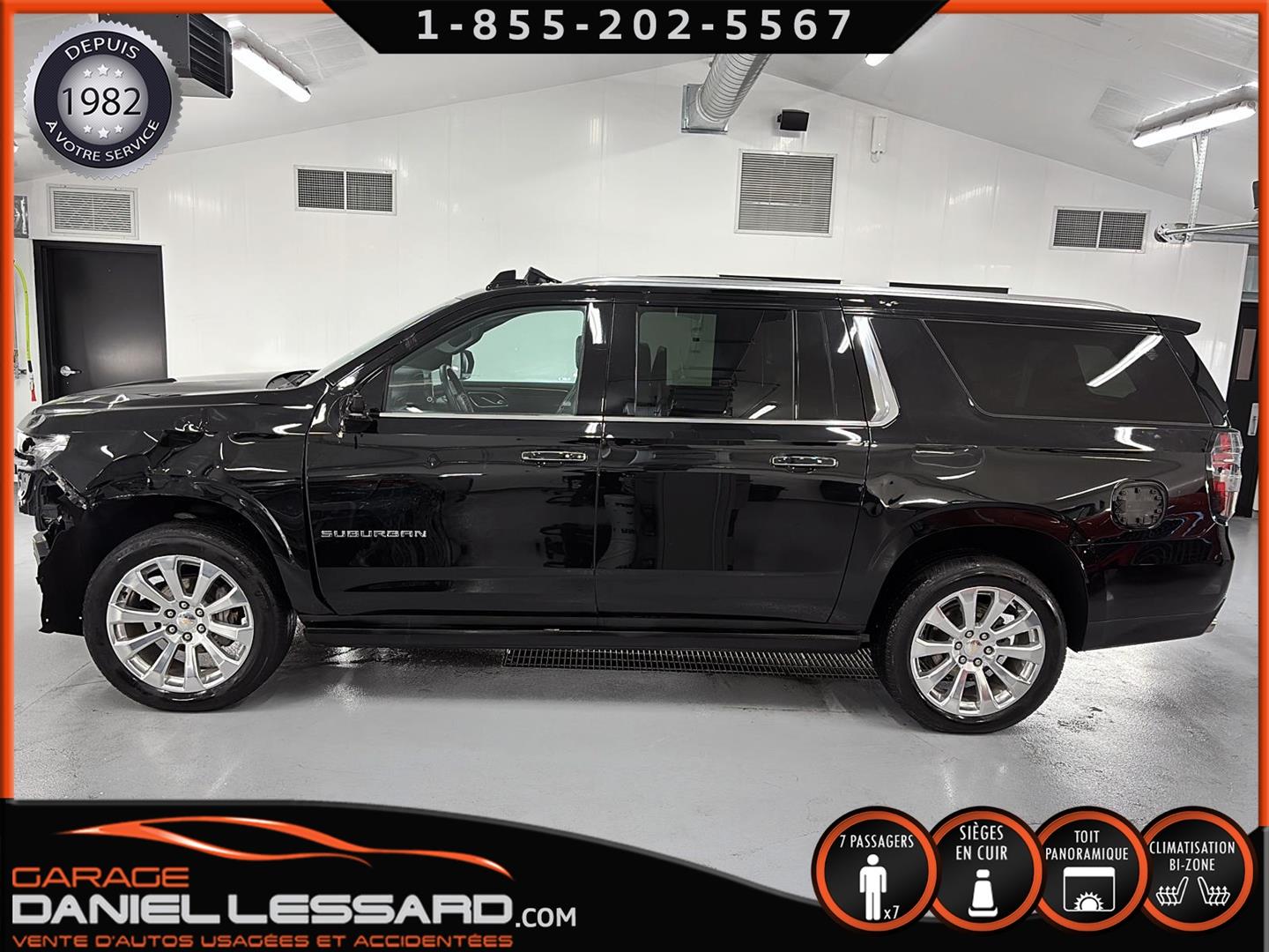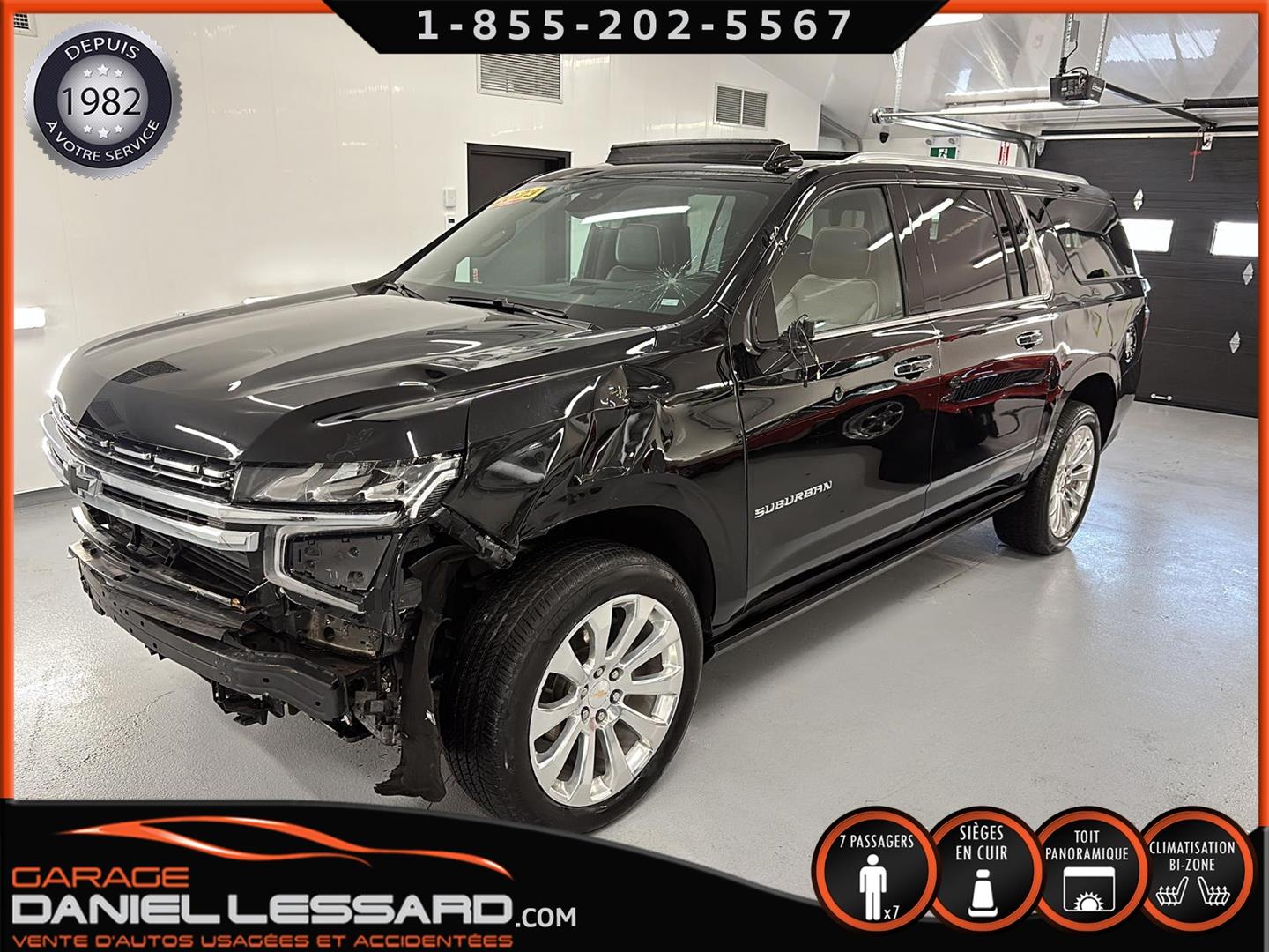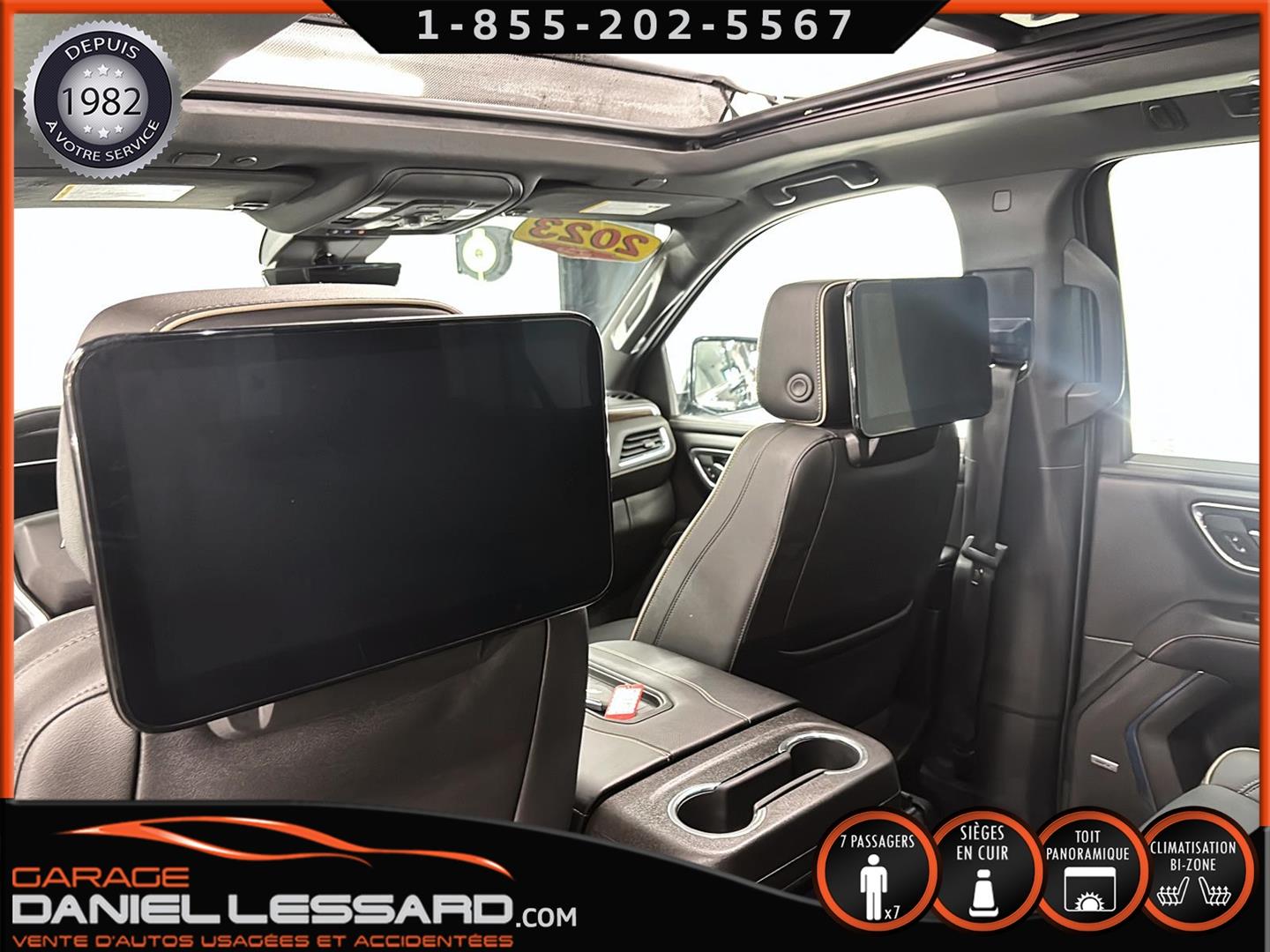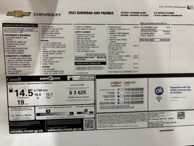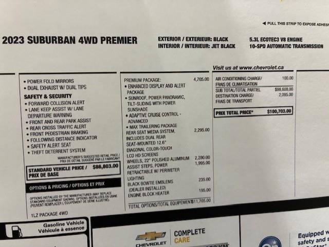 CHEVROLET SUBURBAN 4WD ** PREMIER ** 2023, AVEC LE PREMIUM PACKAGE ( OPTION GM DE 4705$ ) BAS KM, MOTEUR V-8 DE 5.3 LITRES, BUCKET SEAT 7 PLACES, GROUPE ÉLECTRIQUE PLUS QUE COMPLET, BANC AVANT ÉLECTRIQUE CHAUFFANT ET CLIMATISÉ, BANC 2 IÈMES RANGÉ CHAUFFANT, SYSTÈME DE NAVIGATION, RADIO SATELLITE, 2 TÉLIVISION APRÈS LE DOS DES 2 BANCS AVANT ( OPTION GM DE 2295$ ) CAMERA ET SENSOR DE PROXIMITÉ, TOIT OUVRANT PANORAMIQUE, MAGS 22 POUCES POLI ( OPTION GM DE 2280$ ) AVEC PNEU D'ÉTÉ BRIGESTONE 275 / 50 / 22 AVEC 30% D'USURE , MARCHEPIEDS ÉLECTRIQUE ( OPTION GM DE 1995$ ), BLACK EMBLEMS ( OPTION DE 235$ ) ENSEMBLE REMORQUAGE ( MAX TRAILERING PACKAGE ) AVEC MODULE DE FREIN INTÉGRÉ, MODE 2HI, 4 HI ET 4 LO, SYSTÈME DE SON BOSE, 1 CLÉ AVEC DÉMARREUR A DISTANCE ET TAPIS DE TISSUS