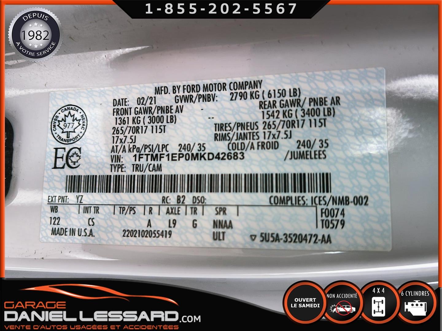 RES BEAU FORD F-150 XL 2021 DE COULEUR BLANC AVEC SEULEMENT 72652 KM, 4X4 AVEC MODE DIFFÉRENTIEL A BLOCAGE AVEC RATIO DE 3,55, MOTEUR FIABLE ET ÉCONOMIQUE UN BON V6 2,7 ECOBOOST, TRANSMISSION AUTOMATIQUE A 10 RAPPORTS, CONSOLE DU CENTRE RABATTABLE POUR UN 3E OCCUPANTS, EDITION XL AVEC INTÉRIEUR EN TISSUS GRIS ET FOND EN CAOUTCHOUC, OUVERTURE DE VITRE MANUEL, AFFICHAGE SUR ÉCRAN DE BORD TACTILE CAMÉRA DE RECUL, COMMANDE VOCAL ET MAIN LIBRE AU VOLANT, AIR CLIMATISÉ, ENSEMBLE REMORQUAGE AVEC HITCH ET ENTRÉ POUR FILAGE 4 ET 7 BRINS ET BOITIER DE FREIN AFTER MARKET AJOUTER PAR LANCIEN PROPRIO, MODE TOW/HAUL, PRISES USB / 12 V ET UNE 110 V, CHAUSSÉ SUR PNEUS D'ÉTÉ GOOD YEAR WRANGLER 265 / 70 / 17 MONTÉ SUR JANTES 17 POUCES, VIENT AVEC 1CLEFS. A VOIR