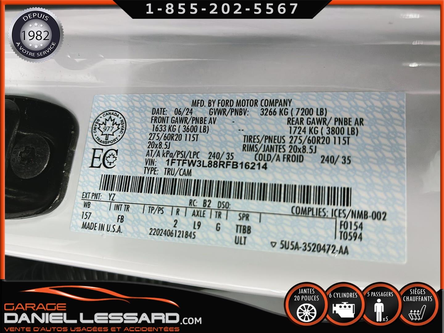FORD F-150 XLT CREW CAB 4 X 4 2024, BAS KM, BOITE DE 6.5 PIEDS, MOTEUR 3.5 LITRES ECOBOOST, BANC AVANT ÉLECTRIQUE CHAUFFANT, CONTROL AUDIO, TÉLÉPHONIQUE ET CRUISE CONTROL AU VOLANT, GROSSE ECRAN, SYSTÈME DE NAVIGATION, CAMERA DE RECUL + SENSOR DE PROXIMITÉ, SIRIUS, CLIMATISATION 2 ZONES, ENSEMBLE REMORQUAGE, MODULE DE FREIN ÉLECTRIQUE FORD, PRO TRAILER, MODE 2HI, 4 HI ET 4 LO, VITRE TEINTÉ, ÉCHELLE DANS LA BOITE, BACK GLASS COULISSANTE, MAGS AVEC PNEU TOYO OPEN COUNTRY 275 / 60 / 20 HOMOLOGUÉ AVEC 50% D'USURE, TOILE SUR LA BOITE, ÉCHELLE DANS LE PANNEAU, 1 CLÉ AVEC DÉMARREUR A DISTANCE ET TAPIS DE CAOUTCHOUC