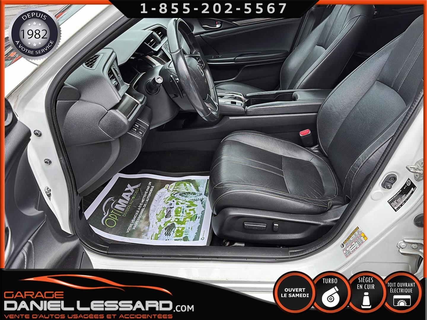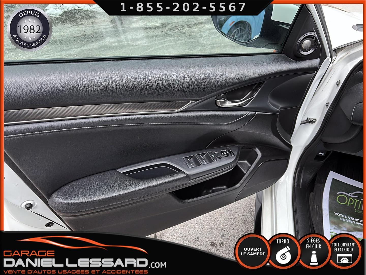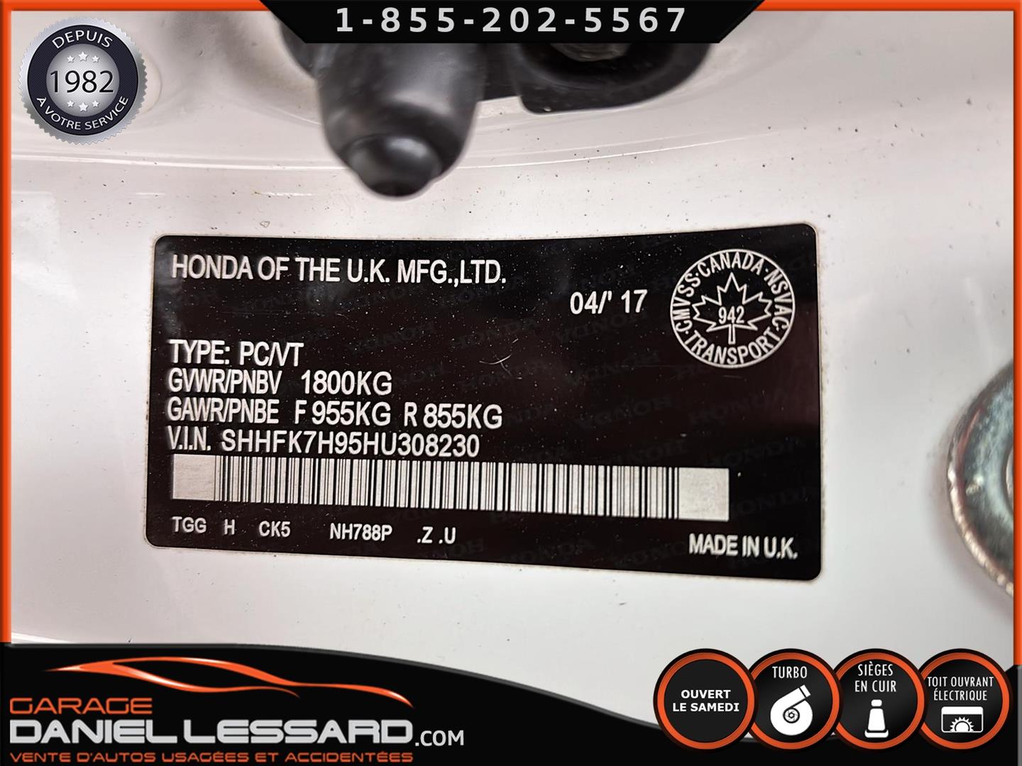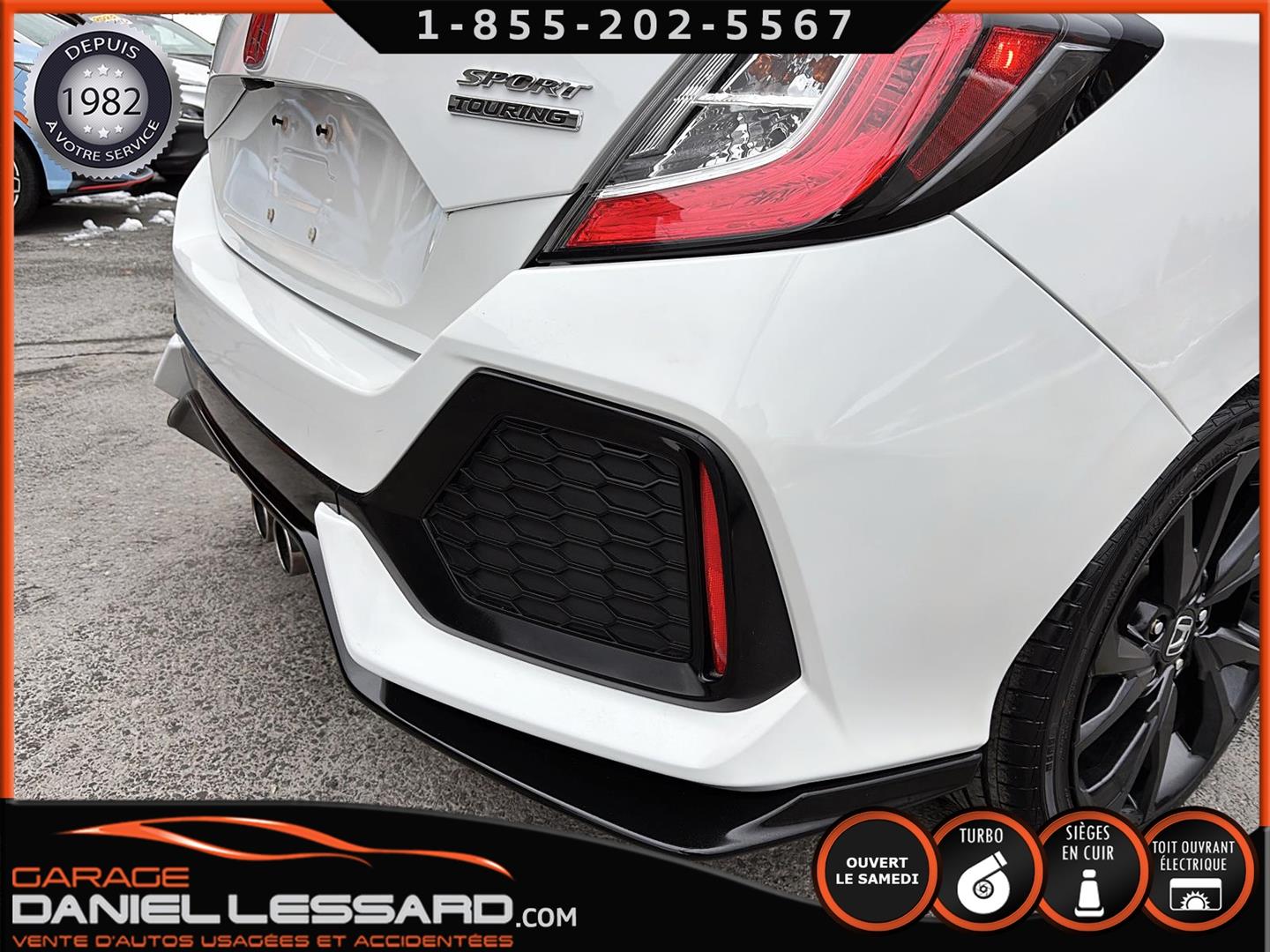 HONDA CIVIC 4 PORTES À HAYON HBK *SPORT TOURING* 2017, BLANC PERLE, TRANSMISSION AUTOMATIQUE AVEC PADDLE SHIFT AU VOLANT, TOIT OUVRANT, MOTEUR 1.5 LITRES TURBO, INTÉRIEUR EN CUIR AVEC BANC AVANT ET ARRIÈRE CHAUFFANT, LES 2 SIÈGES AVANT SONT ÉLECTRIQUES, LE SIÈGE CONDUCTEUR À 8 RÉGLAGES ET PASSAGER AVANT À 4 RÉGLAGES, SYSTÈME DE NAVIGATION GPS D'ORIGINE, RADIO SATELLITE XM, CAMÉRA DE RECUL ET ANGLE MORT, ÉCRAN TACTILE, SYSTÈME D'ALERTE COLLISION ET ASSISTANCE AU FREINAGE, SYSTÈME D'AVERTISSEMENT DE CHANGEMENT DE VOIE, RÉTROVISEUR ÉLECTROCHIMIQUE, CLIMATISATION 2 ZONES DIGITALE, PHARE AVANT AU DEL, LUMIÈRE À BRUME, PORT USB ET AUXILIAIRE, MODE ÉCO, TRACTION CONTROL, DÉMARRAGE À BOUTON POUSSOIR, SYSTÈME APPLE CARPLAY / ANDROID AUTO, CONNECTIVITÉ WI – FI, RECHARGE SANS FIL POUR APPAREIL COMPATIBLE, RAIN SENSOR, CRUISE ADAPTATIF MONTÉ AU VOLANT, VITRES TEINTÉES, MOULURE DE BAS DE PORTE ET JUPE NOIR PEINTES, MAGS AVEC PNEU D'ÉTÉ MOMO M3 225 / 40 / 18 USÉE A 50%, AILERON, VITRE TEINTÉ, 1 CLÉ INTELLIGENTE AVEC DÉMARREUR À DISTANCE ** LES MAGS ONT ÉTÉ REPEINT, PETITE IMPERFECTION AU PARE CHOC ARRIERE **
