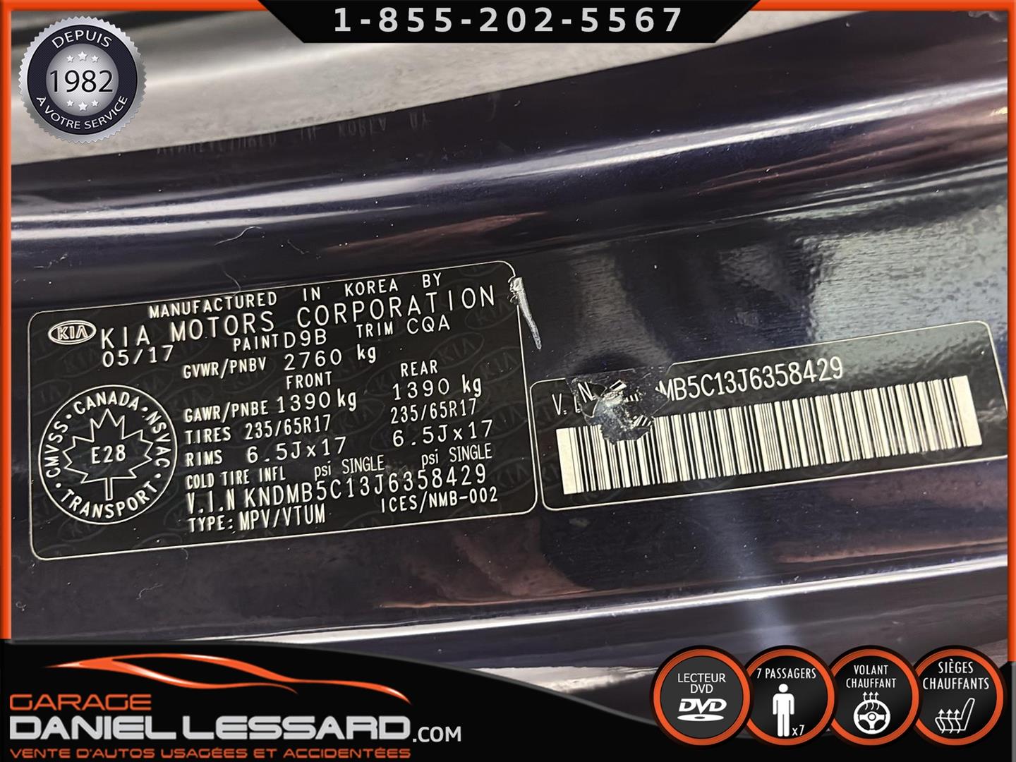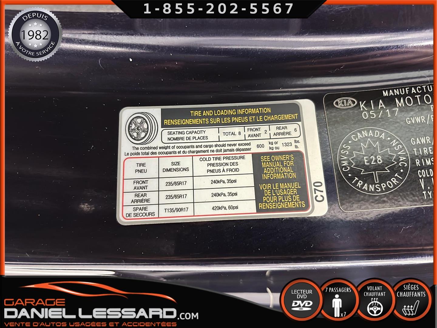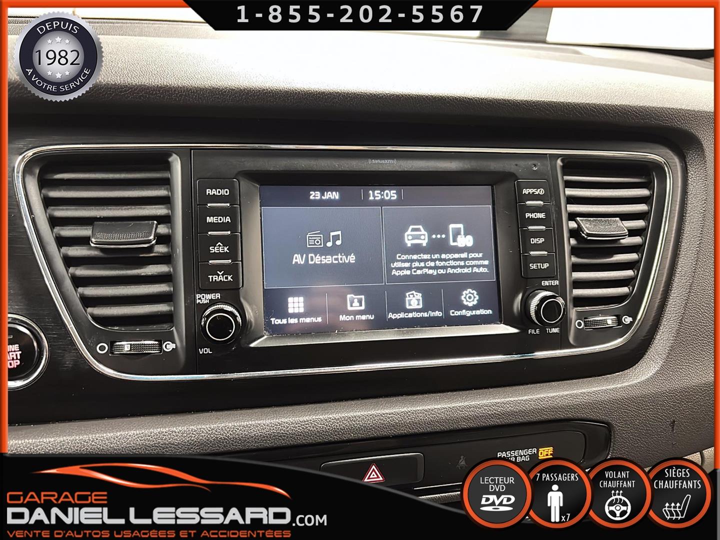 KIA SEDONA LX+, MOTEUR V6 3,3 L, TRANSMISSION AUTOMATIQUE À 6 VITESSES, 7 PLACES, SIÈGES LATÉRAUX DE 2E RANGÉE « SLIDE-N-STOW », SIÈGES AVANT CHAUFFANTS, VOLANT CHAUFFANT, PORTES COULISSANTES ÉLECTRIQUES DOUBLES, LECTEUR DVD, CLIMATISATION, SYSTÈME AUDIO AVEC ÉCRAN TACTILE DE 7 POUCES, INTÉGRATION POUR SMARTPHONES ANDROID AUTO ET APPLE CARPLAY, RÉGULATEUR DE VITESSE AU VOLANT, HAYON ÉLECTRIQUE INTELLIGENT, JANTES EN ACIER DE 17 POUCES AVEC ENJOLIVEURS, PNEUS D'HIVER MICHELIN X-ICE 235/65/17, UNE SEULE CLÉ DISPONIBLE, MANUEL DU PROPRIÉTAIRE, DÉMARREUR À DISTANCE!!