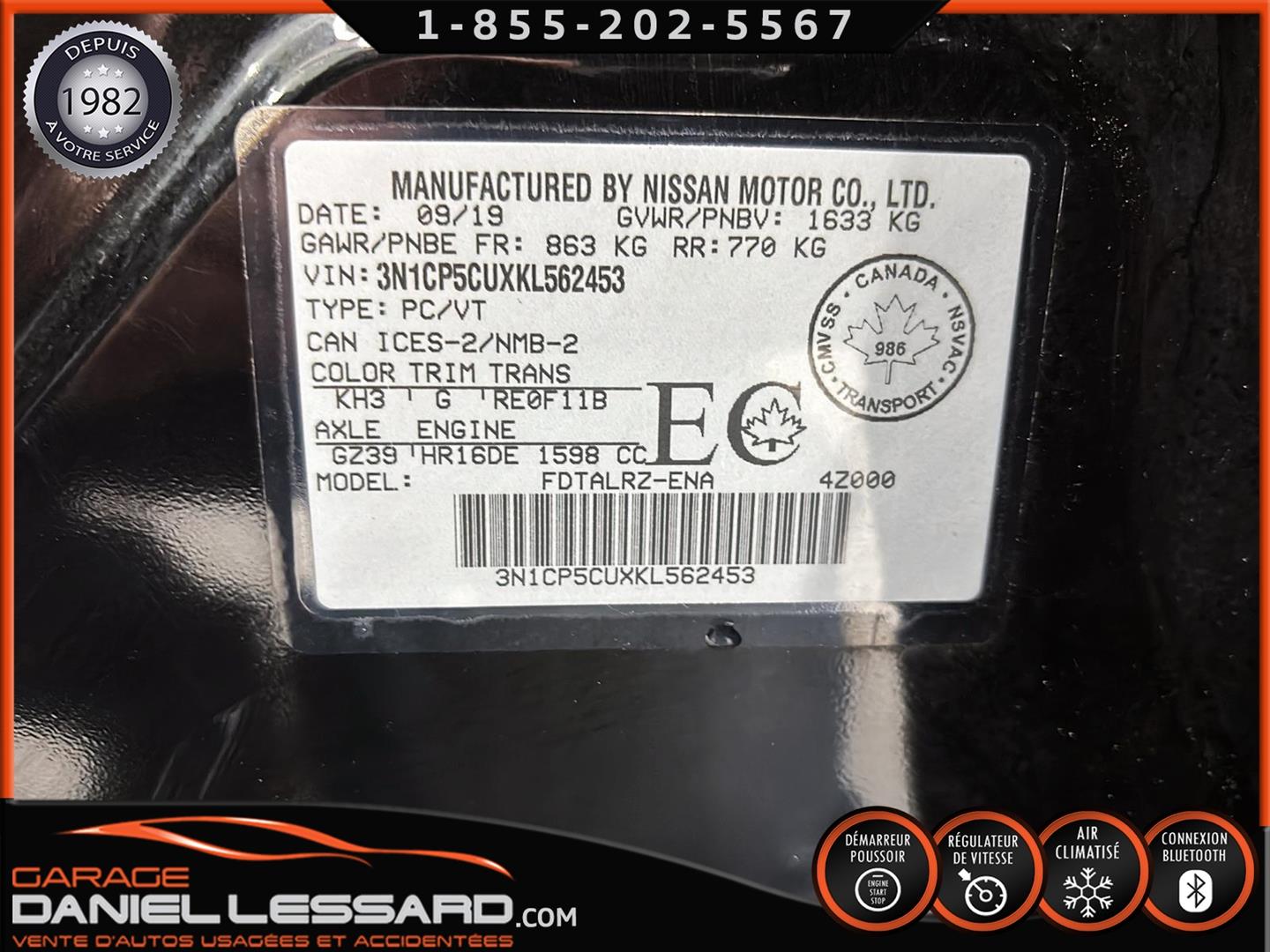 NISSAN KICKS S 2019, MOTEUR 4 CYLINDRES, 16 SOUPAPES À DACT DE 1,6 L, BOÎTE XTRONIC CVT, JANTES EN ACIER DE 16 PO AVEC ENJOLIVEURS SUR PNEUS D’HIVER GENERAL ALTIMAX 205/60/16, TÉLÉDÉVERROUILLAGE DES PORTIÈRES SANS CLÉ ET DÉMARRAGE PAR BOUTON-POUSSOIR, SIX HAUT-PARLEURS, ÉCRAN COULEUR TACTILE DE 7 PO, SYSTÈME TÉLÉPHONIQUE MAINS LIBRES BLUETOOTH, SYSTÈME DE FREINAGE D’URGENCE INTELLIGENT ET AVERTISSEMENT DE RISQUE DE COLLISION FRONTALE, NOUS AVONS SEULEMENT 1CLÉ, MANUEL DU PROPRIÉTAIRE.