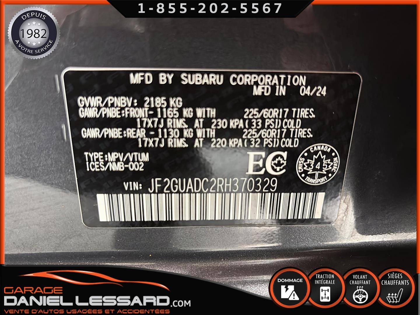 SUBARU CROSSTRECK TOURING AWD 2024, BAS KM SEULEMENT 38798, GROUPE ÉLECTRIQUE COMPLET, SYSTEM EYE SIGHT, CONTROL AUDIO TÉLÉPHONIQUE, CRUISE CONTROL ET VITESSE AU VOLANT, GROSSE ECRAN TACTILE, CAMÉRA DE RECUL, SIRIUS, CLIMATISATION 2 ZONES, PUSH START, LES BANC AVANT ET LE VOLANT SONT CHAUFFANT, TAPIS CAOUTCHOUTÉ PORTE BAGAGE, NOUS AVONS 1 CLEF, MONTÉ SUR MAG 17 AVEC PNEUS HIVER OVATION EN 225-60-17, VÉHICULE ACCIDENTÉ VGA A RÉPARER