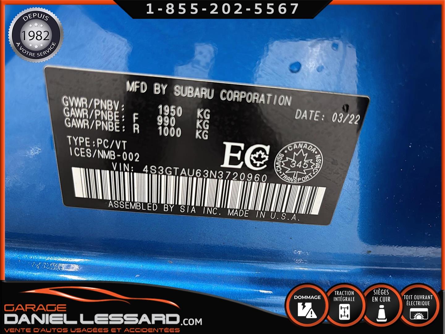 SUBARU SPORT-TECH AWD EYESIGHT 2022, BAS KM, INTÉRIEUR EN CUIR, BANC CONDUCTEUR ÉLECTRIQUE, BANC AVANT CHAUFFANT, CONTROL AUDIO, TÉLÉPHONIQUE, CRUISE CONTROL ET VITESSE AU VOLANT, MAGS D'HIVER AVEC PNEU D'HIVER CONTINENTAL VICKING CONTACT 205 / 55 / 16 AVEC 50% D'USURE, CLIMATISATION 2 ZONES, CAMERA ET SENSOR DE RECUL, 1 CLÉ