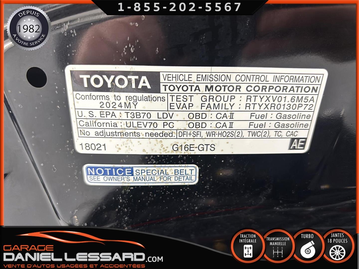 TOYOTA GR COROLLA CORE 2024, MOTEUR 3 CYLINDRES TURBO DE 1,6 L PRODUIT UNE PUISSANCE DE 300 CHEVAUX ET UN COUPLE DE 273 LB-PIEDS, TRANSMISSION MANUELLE 6 VITESSES AVEC CORRESPONDANCE DU RÉGIME EN RÉTROGRADATION, TRACTION INTÉGRALE GR-FOUR, SYSTÈME MULTIMÉDIA AVEC ÉCRAN TACTILE DE 8 PO ET 8 HAUT-PARLEURS, DE ROUES DE 18 PO EN ALLIAGE NOIRES SUR PNEUS MICHELIN PILOT SPORT 235/40ZR18, DIFFÉRENTIELS AVANT ET ARRIÈRE À GLISSEMENT LIMITÉ TORSEN, DE SIÈGES SPORT AVANT CHAUFFANTS RECOUVERTS DE TISSU GR SPORT, ACCÈS SANS CLÉ, PHARES ET DE FEUX DE JOUR À DEL, DE PHARES ANTIBROUILLARD, D’UN SYSTÈME AUTOMATIQUE DE CONTRÔLE DE LA TEMPÉRATURE, DE DEUX PRISES DE RECHARGE USB-C, D’UN VOLANT GAINÉ DE CUIR. DES ÉTRIERS DE FREINS PEINTS EN ROUGE. LE MONITEUR D’ANGLE MORT AVEC AIDE À LA SORTIE SÉCURITAIRE, APPLE CARPLAY ET À ANDROID AUTO SANS FILS, ÉCRAN MULTIFONCTION DE 12,3 PO PERMET AU CONDUCTEUR DE VOIR LA VITESSE ENGAGÉE, LE TACHYMÈTRE, LA PRESSION DU TURBO ET LE COMPTEUR GR AVEC INDICATEUR DE MODE DE TRACTION, NOUS AVONS SEULEMENT 1 CLÉ !!!